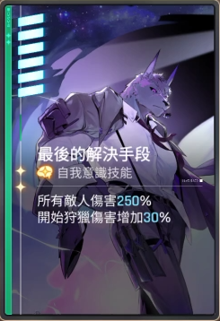 内在的记忆(强化战斗被动效果)每当发动开始狩猎时,获得解决师的愤怒1