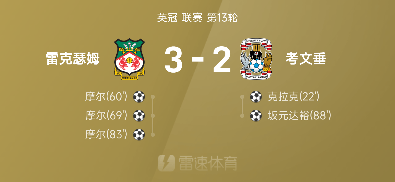 英冠战报:摩尔戴帽,坂元达裕传射,雷克瑟姆3-2考文垂