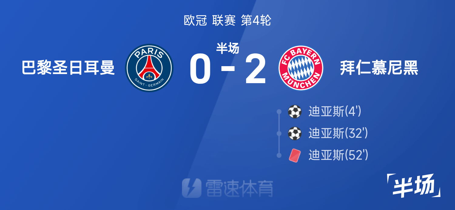 雷速体育11月05日讯 25/26赛季欧冠联赛第4轮,巴黎圣日耳曼迎战拜仁慕尼黑。半场战罢,双方比分暂为巴黎圣日耳曼0-2拜仁慕尼黑,迪亚斯上演梅开二度,迪亚斯染红。