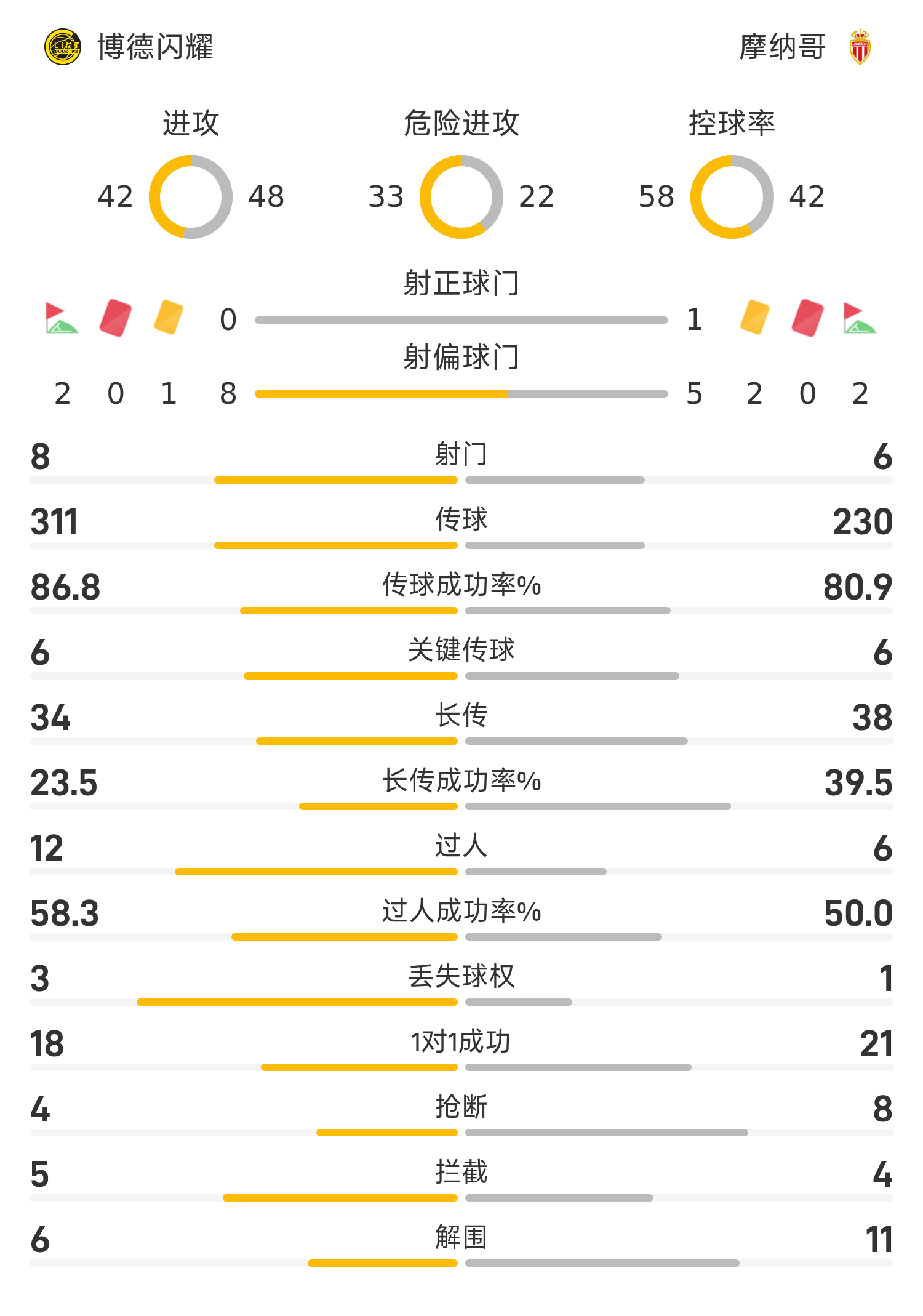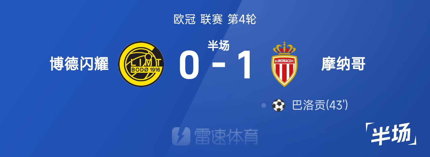 雷速体育11月05日讯 25/26赛季欧冠联赛第4轮,博德闪耀迎战摩纳哥。半场战罢,双方比分暂为博德闪耀0-1摩纳哥,巴洛贡破门建功。