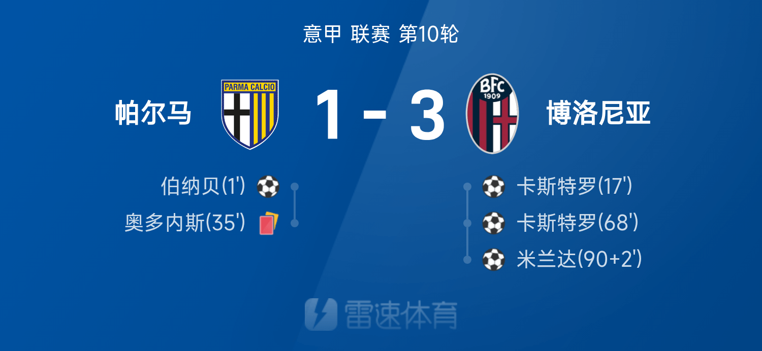 雷速体育11月03日讯 25/26赛季意甲联赛第10轮,博洛尼亚3-1战胜帕尔马。全场比赛,卡斯特罗上演梅开二度,米兰达破门建功,伯纳贝破门难救主。