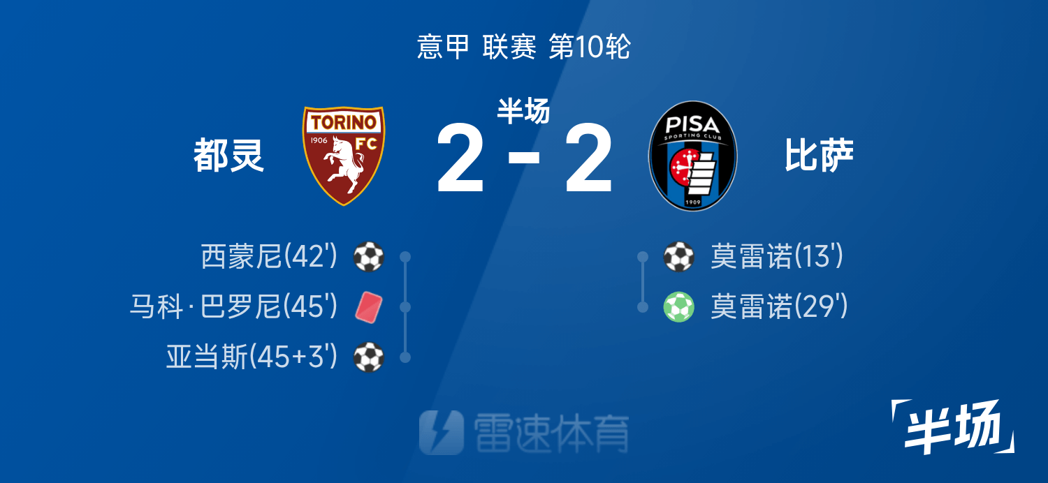 雷速体育11月02日讯 25/26赛季意甲联赛第10轮,都灵迎战比萨。比赛中莫雷诺梅开二度帮助比萨客场领先2球,随后西蒙尼头球扳回一城,亚当斯扳平比分。半场战罢,双方比分暂为都灵2-2比萨。