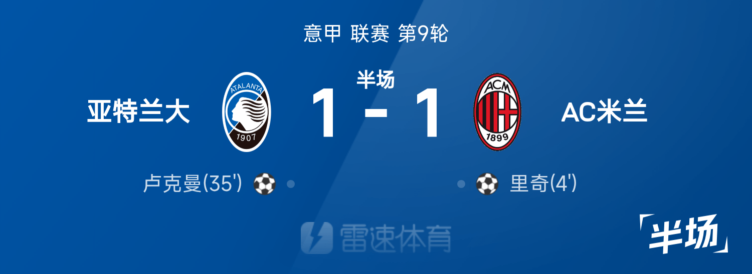 雷速体育10月29日讯 25/26赛季意甲联赛第9轮,亚特兰大迎战AC米兰。半场战罢,双方比分暂为亚特兰大1-1AC米兰,卢克曼、里奇破门建功。